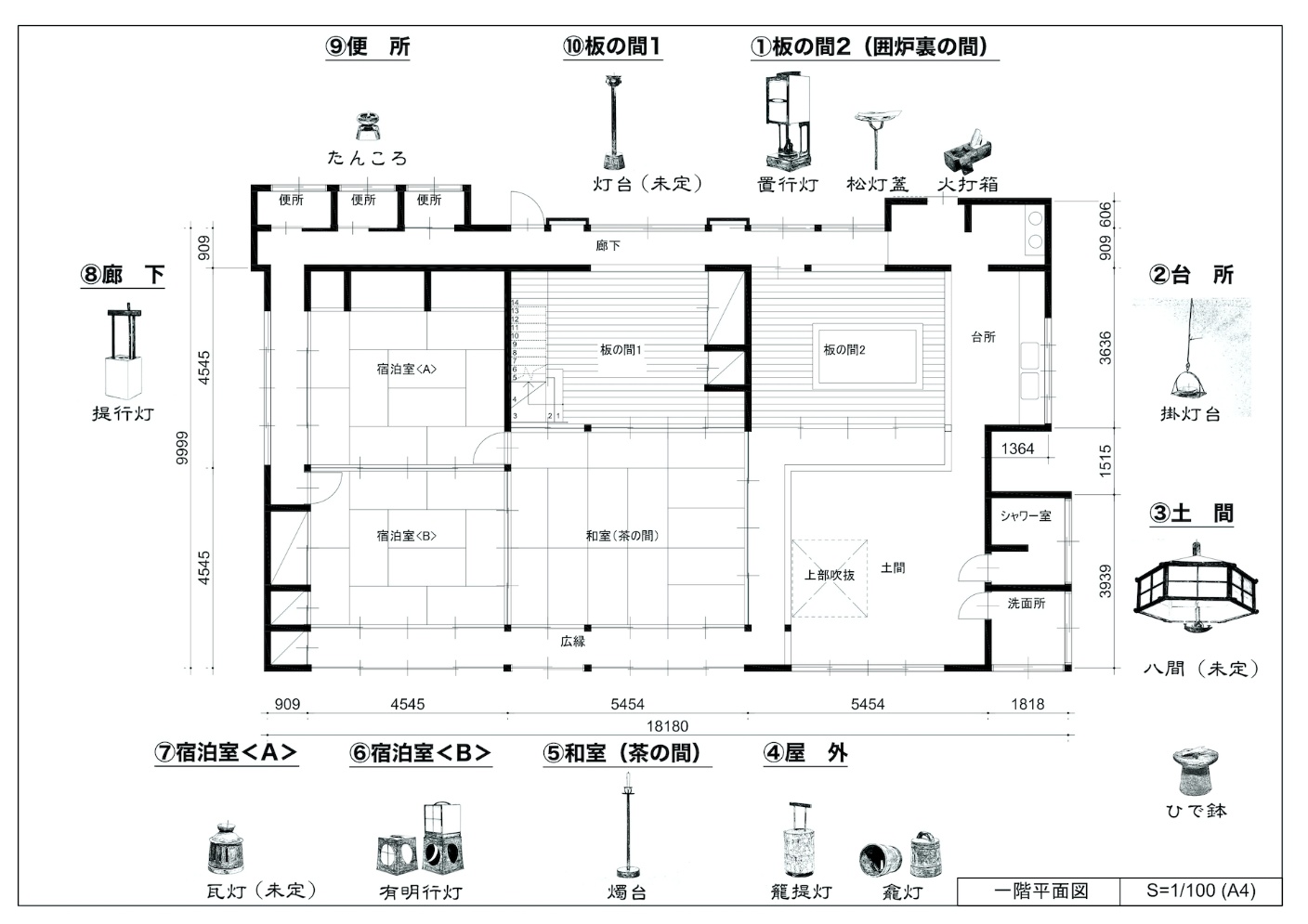 使用灯火器は下図の通り。スタッフの管理ができない廊下や便所は安全上の為、LED光源や既設の電灯を利用した。 尚、掛灯台、たんころ、灯台、ひで鉢は使用しなかった。