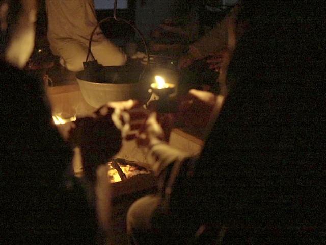 日が暮れはじめ、鍋の中が暗く闇鍋状態になってきた為、途中から囲炉裏脇に据えた松灯蓋にヒデ松を灯して鍋の中を照明した。