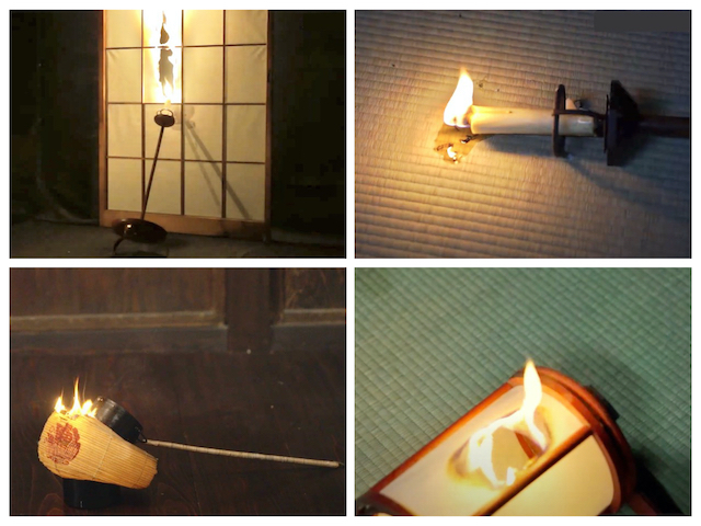 蝋燭を使う燭台や提灯などは、蝋燭は倒れても燃え続ける為、近くに可燃物があった場合、それに燃え移る可能性もあり危険性は高い。燭台に関しては万一倒れても障子や襖などに届かない様に、適当な離隔距離をとる事が望ましく、難しい場合は障子や襖を外すなどの対策も考える必要があるが、今回は時間の都合もあり、座敷での使用はやめて土間での点灯とした。