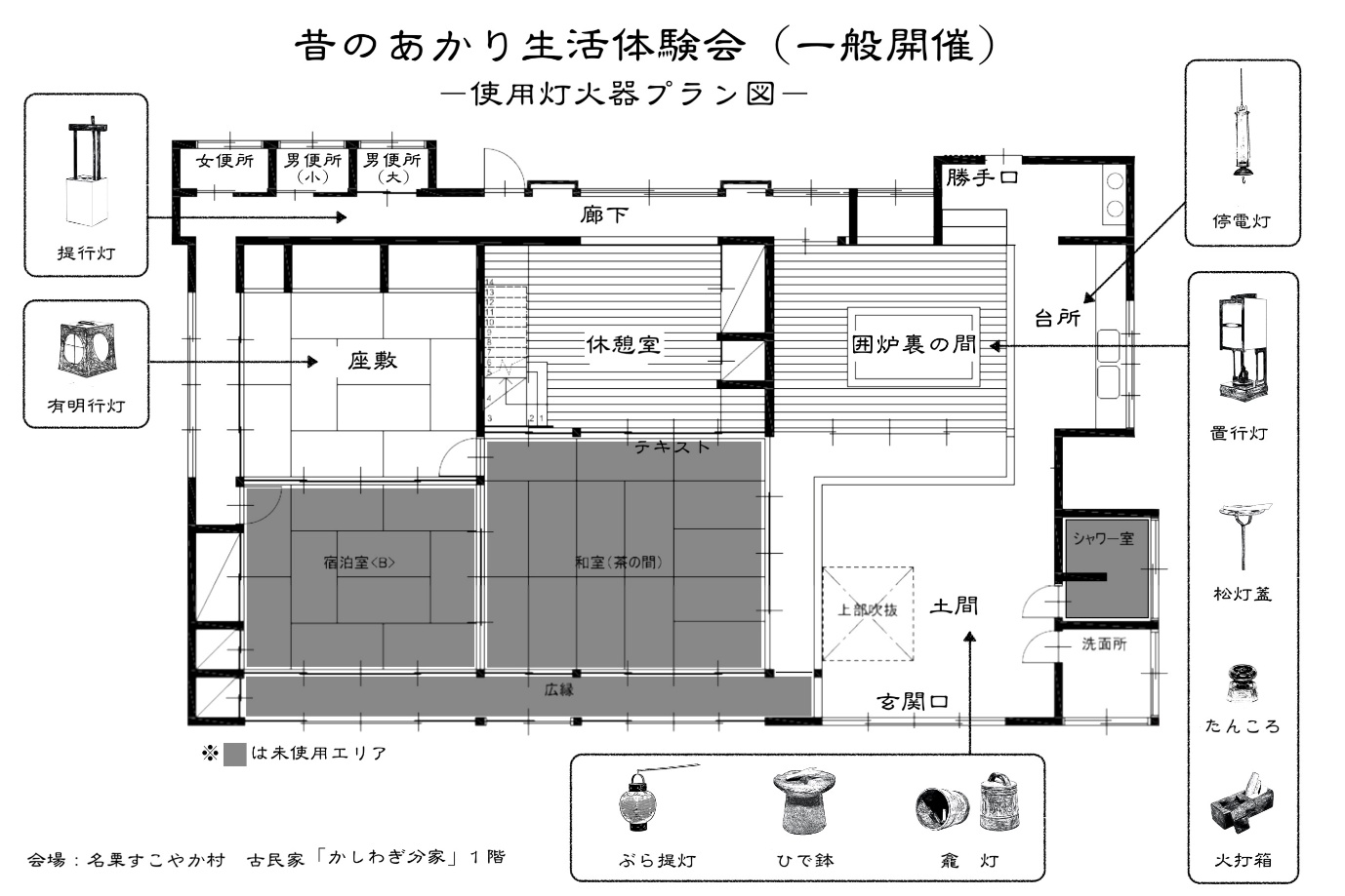 - 明治初期に建てられた古民家「名栗すこやか村 かしわぎ分家」を借りて、囲炉裏や竈などの火を使った生活や灯火のあかりを体験します。薪割りによる燃料準備、火打箱による火起こし、竈を使って行灯用の油搾り、囲炉裏で夕食のすいとん鍋作り、下図の通り実際に火を灯して昔の空間の中で昔のあかりの体験をします。