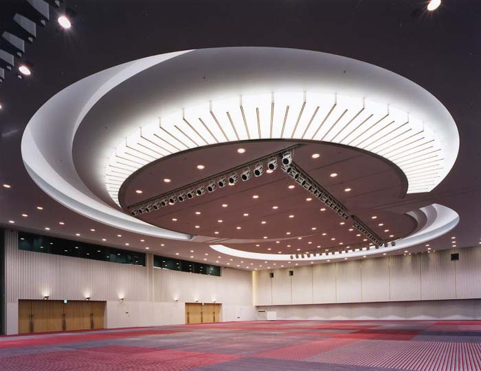 国際会議場のメインホールの照明には、調光可能なミニハロゲン電球500Wと高