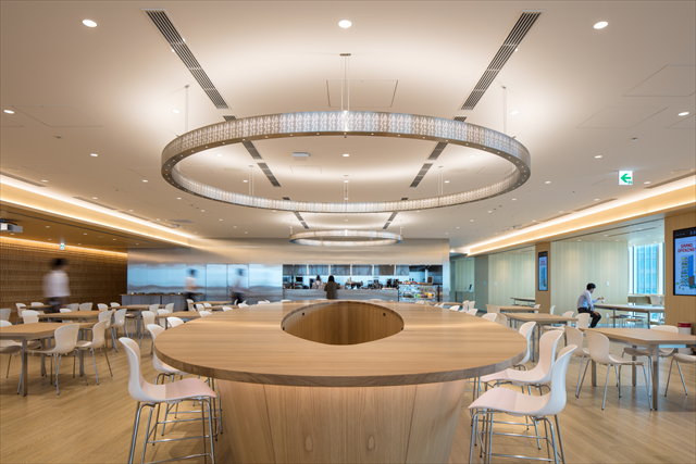 - 4階スカイロビーの照明は独創的でよい雰囲気がでている。