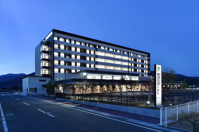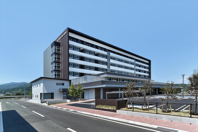 「伊予の小京都」大洲の地域医療支援病院で、老朽化した旧病院の建替えである。大洲の伝統的な町並み景観との調和を考え、漆喰の白や板貼りなどを現代の素材でデザインされている。歴史的にも水害の多い地域から災害対策として止水設備を設置している。