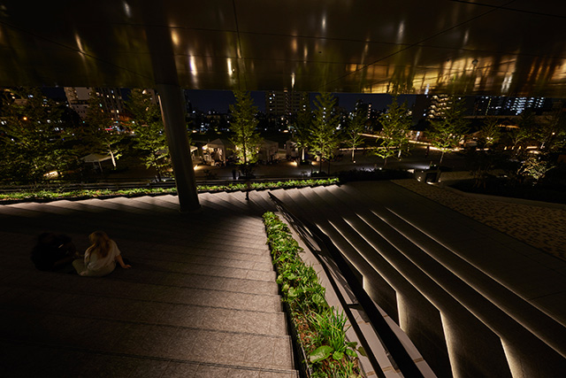 アトリウム空間での昼光活用とライン照明を統合した環境づくりもユニークだが、この施設の光環境の見どころは、隣接公園とキャンパス内部空間を繋ぐ外部階段と軒下空間の境界領域に、間接照明主体の立体的な光環境が形成されている点である。その空間の光は低色温度で公園の賑わい施設と同調し、深い軒天井への間接・反射光が公園に対して開放的な半屋外デッキの雰囲気を作っている。ダウンライトやライン照明は巧みに隠されて間接照明の雰囲気を損なっていない。
