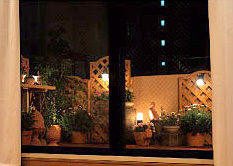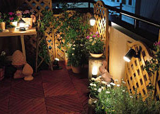 小型のスポットライトやブラケットタイプでテラスのプランターのグリーンや花々をリズミカルに浮き出させたり、木々の下からライトアップすることにより立体感が生まれこうして外を明るくすることによって、一層リビング側が広く感じます。